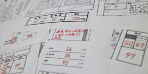 写真は中央中の中1生の定期テスト成績帳票で,学年平均に目をやると中間テストに比べて期末テストは50点近く下降しているのがわかります。